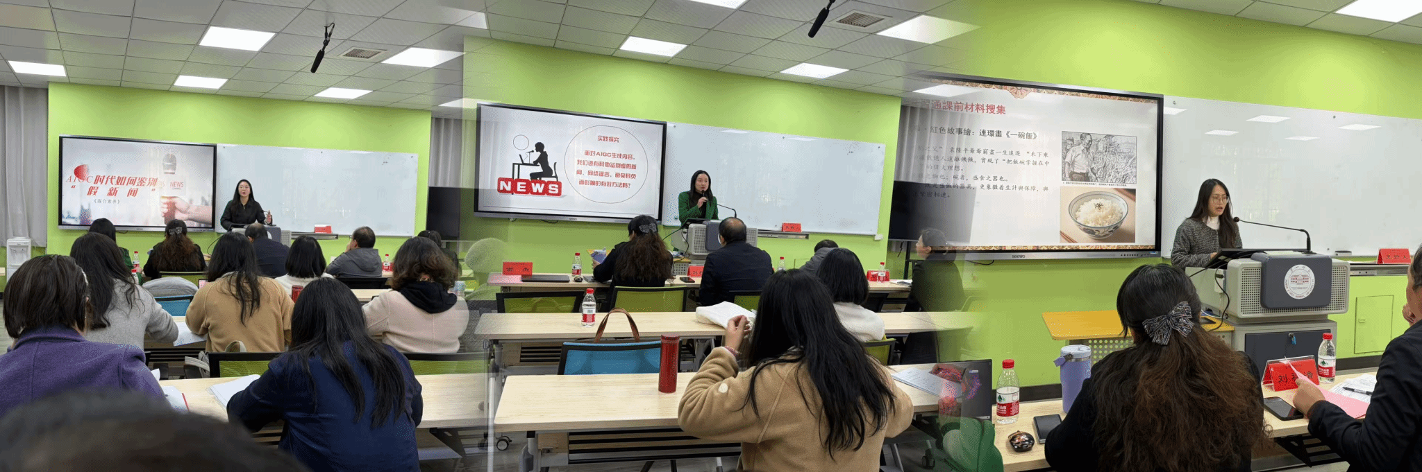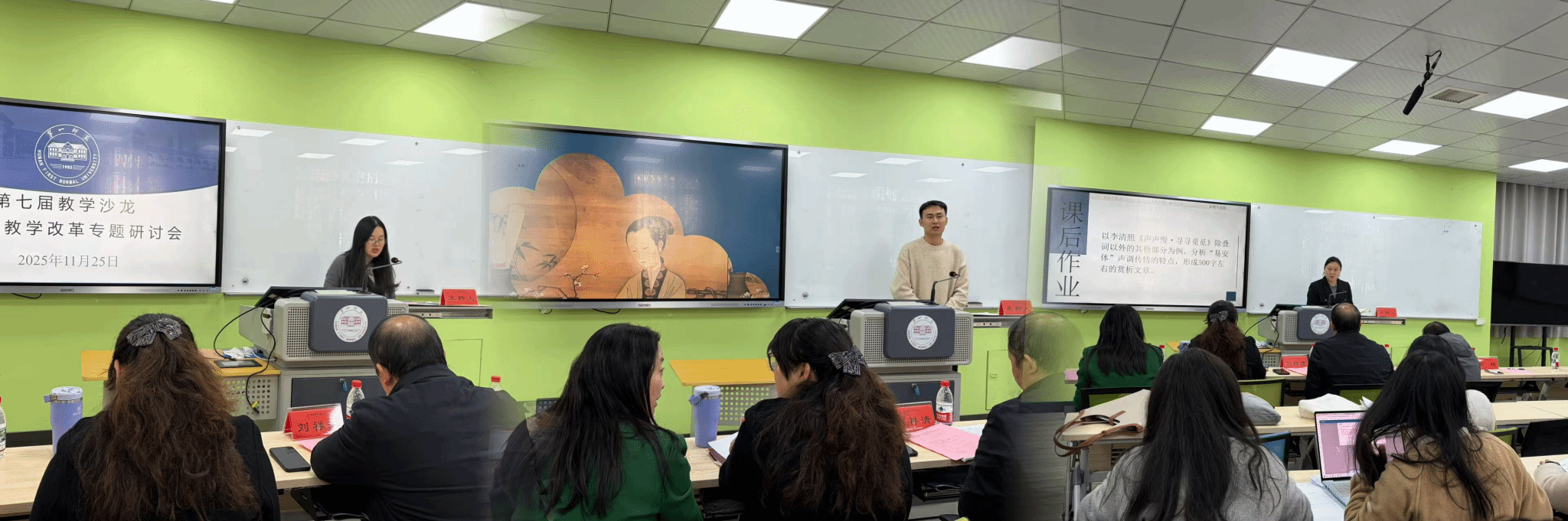 本次教学沙龙以“字韵·字辨·字鉴”为核心主题,紧扣AIGC时代教育数字化转型趋势,深入探讨信息技术与文学、新闻传播学课程深度融合的路径与可能性。会上,张雨顺、屈玉辉、刘子瑜三位教师分别以新进教师汇报课、青年教师教研课、优秀教师示范课为载体,分享金课建设与课程改革的实践探索,呈现了分层递进、各有侧重的教学示范。其中,张雨顺以“李清照《声声慢》的叠词艺术”为题,从情感表达、节奏变化、声调选择三个维度展开深度解析,引导学生沉浸式体悟“易安体”韵律和谐、声调传情的艺术特质;教学中创新运用“雨课堂”平台实时呈现学生讨论成果,并通过AI大数据分析高频词汇,精准检验教学目标达成度,实现了传统文学课程与现代技术的有机结合。屈玉辉的教研课聚焦异体字这一特殊语言现象,以古代典籍中“碗”的字形演变为例,系统剖析异体字的产生根源与文化内涵;课堂深度融入AIGC技术,通过AI模拟历史人物参与讲解、超星教学平台精准分析学生答题数据等创新形式,为AI赋能传统语言类课程提供了可复制、可推广的实践案例。刘子瑜的示范课以“AIGC时代真假新闻鉴别”为核心,精选时效性强、典型性突出的新闻案例,系统提炼AI假新闻的多维特征,引导学生主动探索辨别方法与实践路径,充分彰显了新闻传播学课程“理论联系实际”的学科特色。