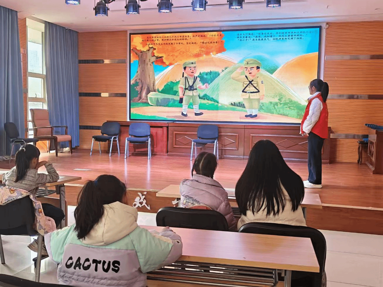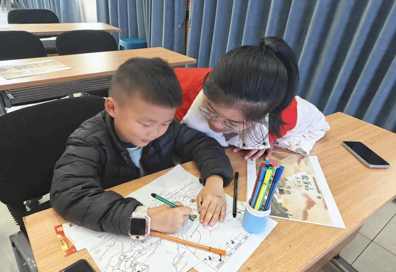 活动以共读《狼牙山五壮士》绘本开始,当志愿者讲到壮士舍身跳崖,现场沉静,孩子们眼眶泛红。志愿者借机引导:“壮士们宁可牺牲自己,也绝不向敌人低头,这份宁死不屈的勇气和无畏的献身精神,就是抗战精神的底色。正是先辈们的这份坚守,才换来了我们现在的幸福生活。”红色火种就此在孩子们心中深深扎根;“信号特训营”中,志愿者讲解抗战通讯困境并传授暗号动作。孩子们弯腰匍匐、屏息接力传讯,遇错迅速校准,默契协同冲锋,在实操中体悟先辈坚守抗敌的精神;“烽火情报站”里,孩子们俯身查密码、提笔记符号、凝神核情报,遇阻时互相提醒,分工破译密信,体悟先辈团结抗敌的智慧;漫画共创中,大家接力勾勒画面、分享创作故事,让红色抗战精神在交流中扎根心底。