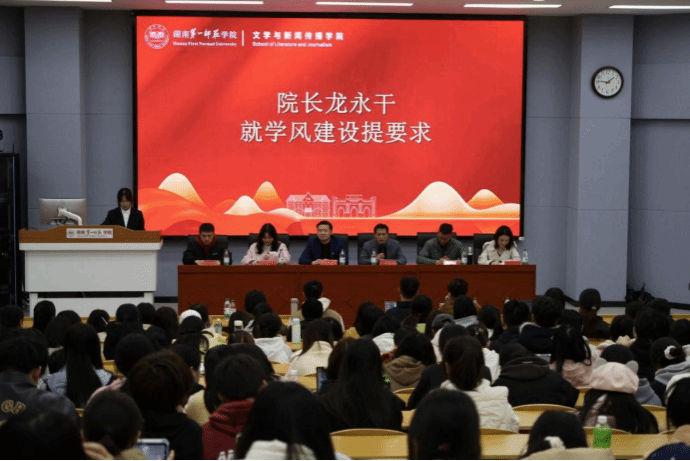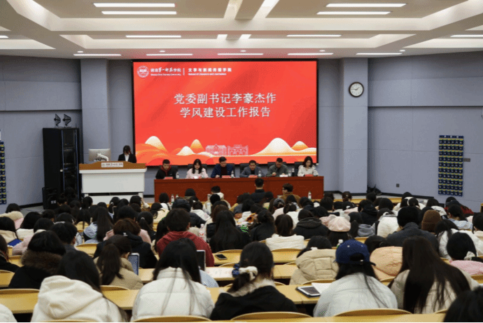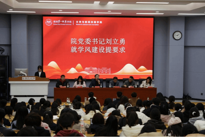 为进一步深化“本科教育教学是基本口粮,人才培养质量是学校生命”的思想认识,以优良学风筑牢立德树人根基,以清正学风驱动学院高质量发展,11月17日晚,文学与新闻传播学院召开2024-2025学年度学风建设总结大会暨2025-2026学年度学风建设启动仪式,院党委书记刘立勇、院长龙永干、院党委副书记李豪杰、学工办全体辅导员出席仪式,学院主席团、学习部、纪检部、秘书部等团学部门代表,各班学生代表共计250余名同学参加启动仪式。