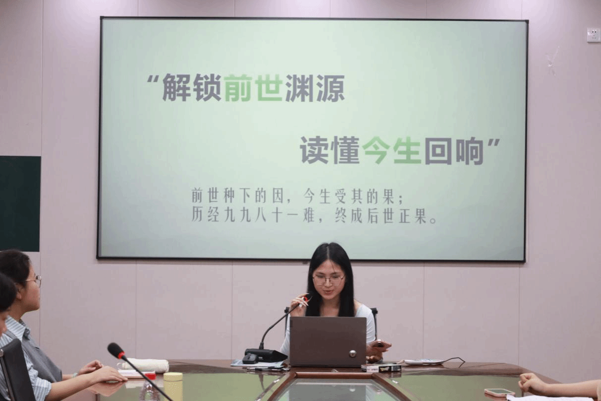 24级中文3班向智欣同学剖析了取经团队及动物精怪的因果脉络,发现其遵循“前世尊贵、犯戒堕落、今生赎罪修行、终获超升”的四阶段结构,该结构以佛教轮回观与业力因果说为核心贯穿始终;24级中文4班的舒文怡同学聚焦主角团人物形象与鲜明性格,通过条分缕析最终得出《西游记》蕴含“三教合一”的思想内涵。多元视角的分享引发现场观众们的思考。